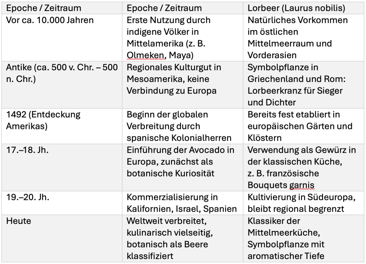 Heute begegnen sich die beiden in der Küche selten. Aber wer weiss – vielleicht ist es Zeit für ein aromatisches Wiedersehen: in einem Gericht, das die cremige Tiefe der Avocado mit der würzigen Noblesse des Lorbeers vereint. Botanisch wäre es jedenfalls ein Familientreffen.